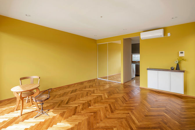 フレンチヘリンボーンの無垢板フローリングの1Rスタジオの2階のお部屋
